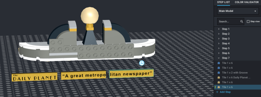 When I started designing a modular Daily Planet, there were a few aspects and elements I knew I wanted, and one of those was to retain the art deco influence of many of the comics that featured the Planet, and that included creating a sign that was evocative of the era. I also knew that for some of the decorative element I was going to have to have tiles printed where default LEGO tiles were not available, especially given that LEGO has never produce a Daily Planet model. Fortunately for brick nerds like me there’s a tool similar to the tool I use to create the models calle Bricklink PartDesigner. If you’re a little design savvy you can create your own decorative bricks, tiles and even minifigures and export them for use in Stud.io.