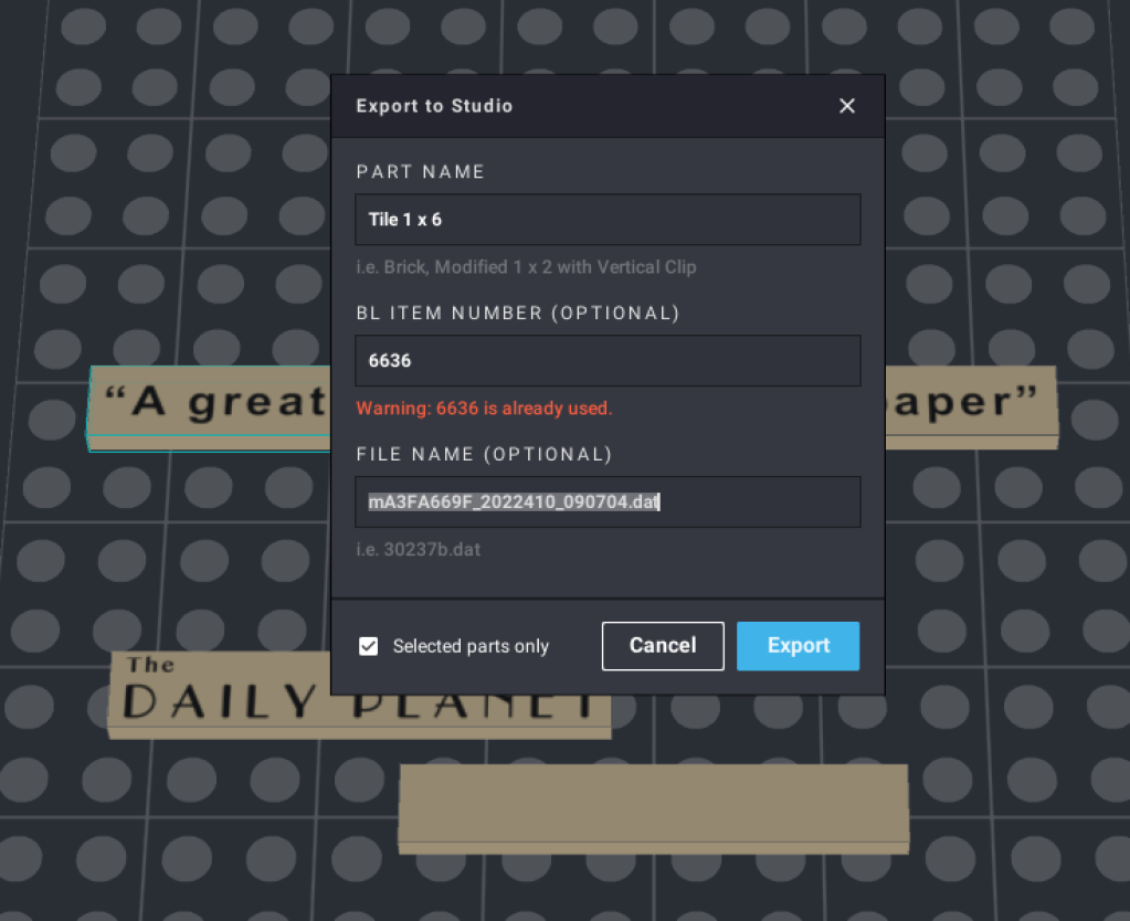 The odd part is that when you use the custom part in a model, the exclamation point will appear saying you’ve used an illegal color, and I tried to figure out why and how to fix it, to no avail. Next I used the great oracle, Google and was rewarded with a link that said all you have to do is add the part number to the custom part before exporting to Stud.io and it will show the available colors for the part your custom part is derived from. I tried as many permutations as I could before i stumbled onto the correct answer. When you start the export you’ll see the dialog below, and all you have to do is put the part number in the “BL Item Number (Optional)” field. If you tab away before saving you’ll see the warning that the part number is already used shown below. Just ignore it and export and Voila! Your part should show the available colors for the base part.