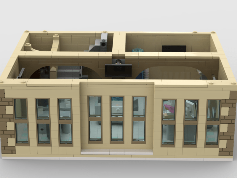 The second floor is the first floor where a staircase moves in to accommodate the stair step design of the building. Another interesting element of the second floor is the use of arches to break the floor up to make it seem busier, and more lifelike.
